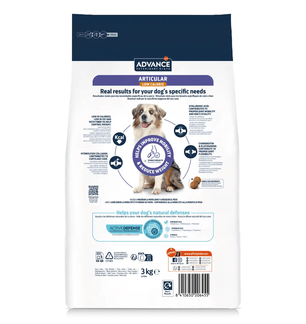 ADVANCE VETERINARY DIETS Articular Low Calorie es un alimento completo y equilibrado, formulado para la recuperación y el apoyo nutricional en el cuidado de las articulaciones en perros adultos con sobrepeso. Ofrece resultados visibles: ayuda a reducir el peso y a preservar la salud y la movilidad articular gracias a su fórmula baja en calorías y a su contenido en ácido hialurónico, colágeno hidrolizado, condroitina, glucosamina y omega 3.  Contiene probióticos, prebióticos, fibras e inmunoglobulinas activas que contribuyen a tener una microbiota intestinal saludable lo cual es clave para unas buenas defensas.