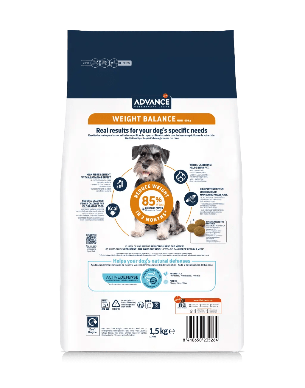 Los resultados de ADVANCE VETERINARY DIETS Weight Balance Mini están clínicamente probados, y el 85 % de