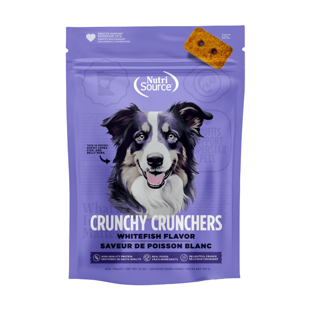 Los NutriSource Whitefish Crunchy Crunchers están elaborados con proteínas de alta calidad.