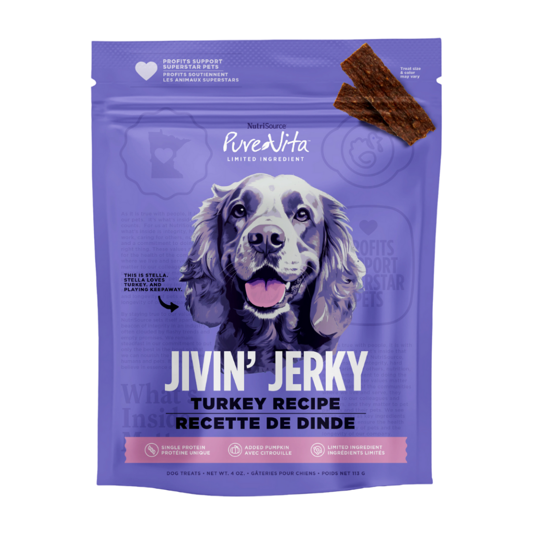NutriSource PureVita Turkey Jivin’ Jerky está elaborado con proteínas de alta calidad.
